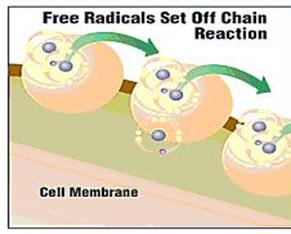 כך נוצרת שרשרת של ריאקציות מהירות, המולקולה הנתקפת שחסר לה אלקטרון הופכת לתוקפת, להשלים לה אלקטרון, וכן הלאה, ונגרם נזק רב לתאים ולרקמות.